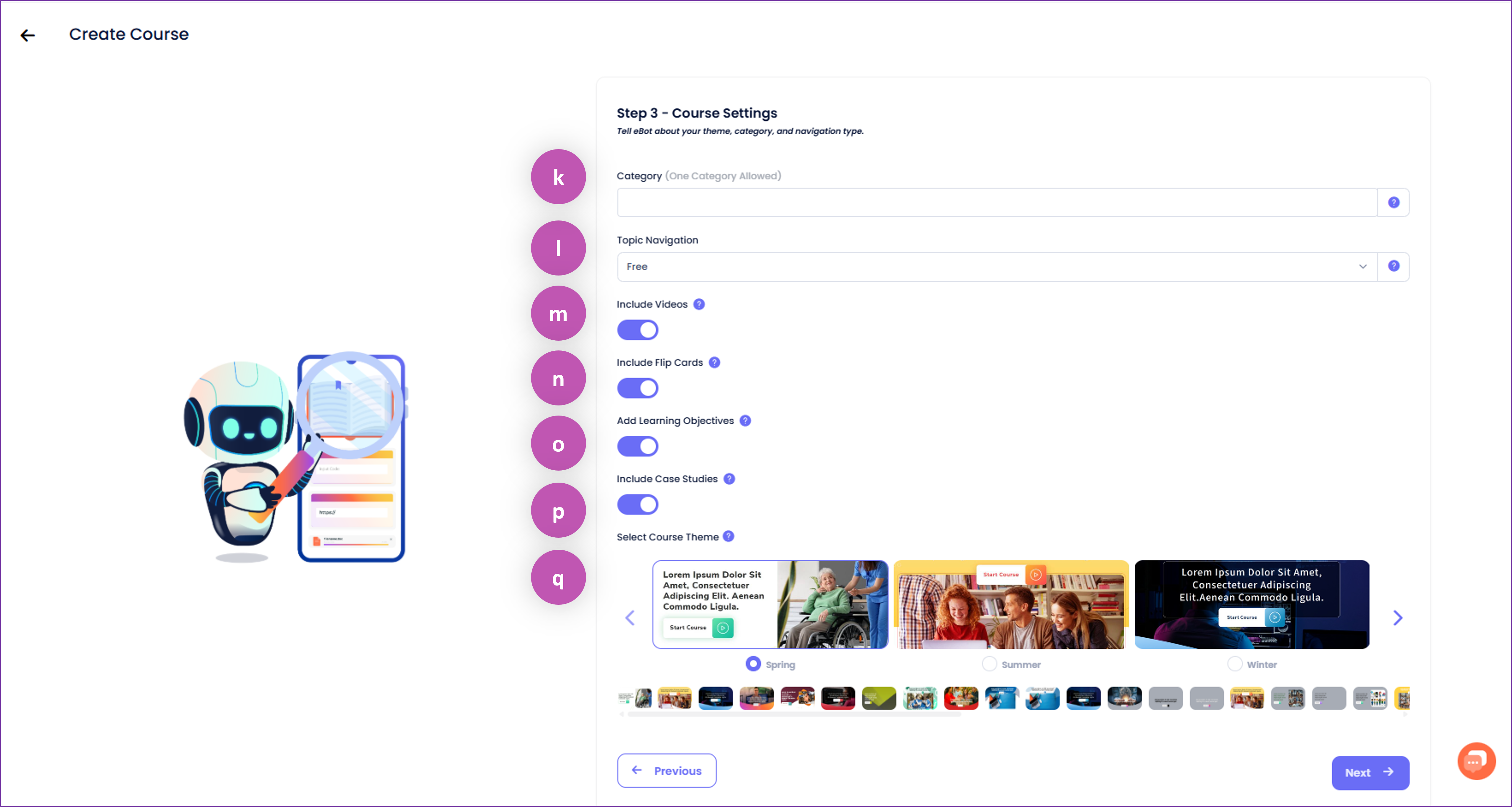o. Learning ObjectivesSwitch on to include learning objectives in the content creation process upon clicking 'Quick Generate Content via AI' in Step 4. If switched off, learning objectives will not be included in the content creation process.