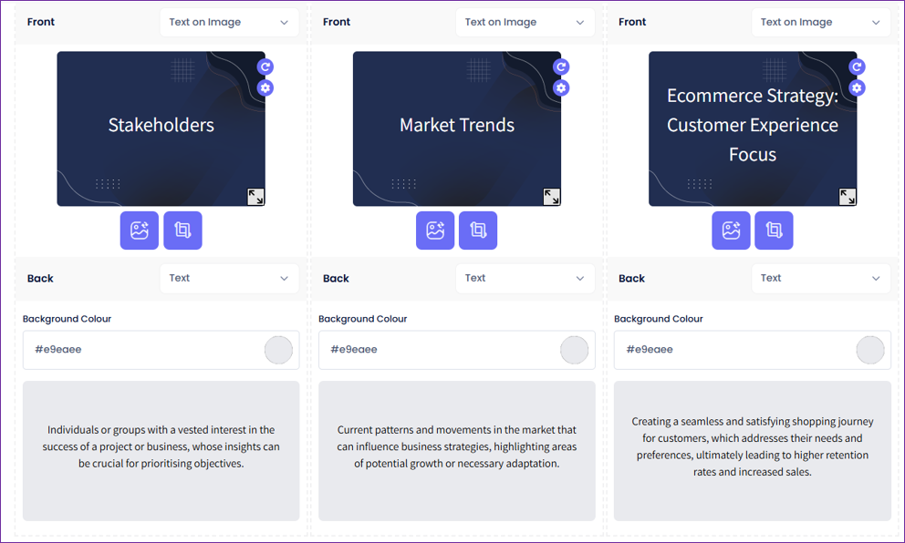Enable this option to include flip cards in your course, providing learners with visual and engaging content to enhance their understanding.When the user enables the 'Include Flip Cards' toggle, the AI will handle the generation of flip cards and will automatically determine the most appropriate flip card layouts for each topic and subtopic based on the content provided in a consistent format, where: