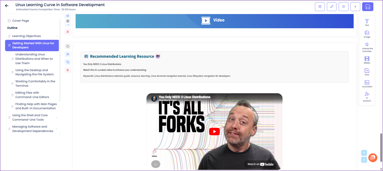 Enable this option to include videos for each topic in your course, providing learners with visual and engaging content to enhance their understanding.In the Course Builder, when the 'Include Videos' toggle is enabled, AI-curated videos relevant to topics and/or subtopics will be placed appropriately where the corresponding concepts are introduced. These videos will be placed in a separate video content block with a content banner.NOTE: This toggle is available for courses with the 'Creative' course creation type and is switched off by default.n. Images