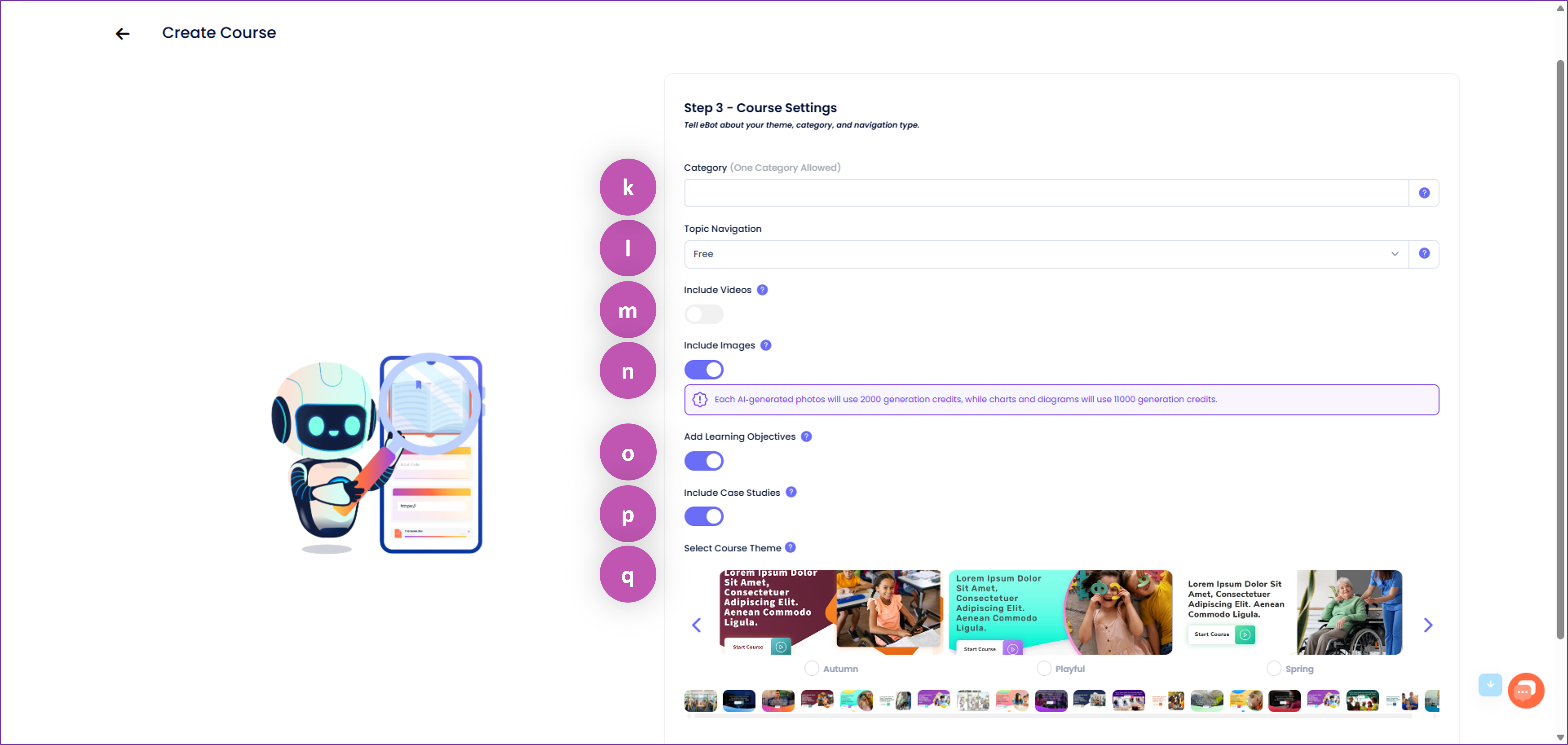 - When toggled on, a reminder about the generation credit cost for photos, charts and diagrams will be displayed in the course settings.