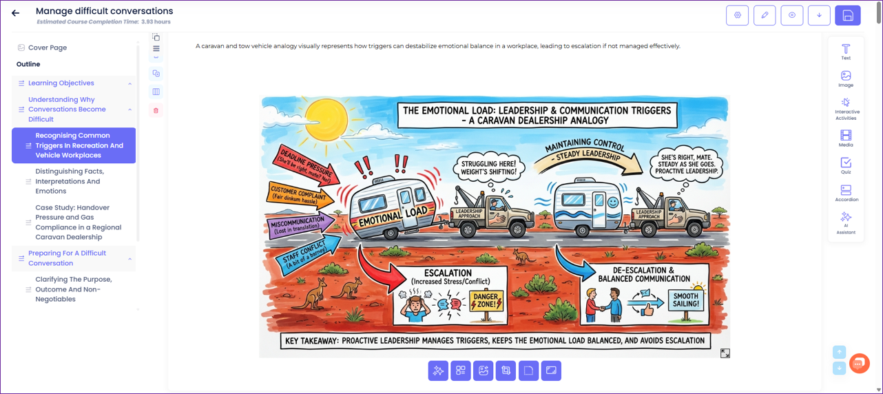 - If ‘Document Conversion’ mode is used and the user regenerates the course, it will default back to ‘Creative’ mode. So it is only during the first creation that the AI will strictly follow the structure and content of the uploaded document, ignoring any course settings provided by the user.
