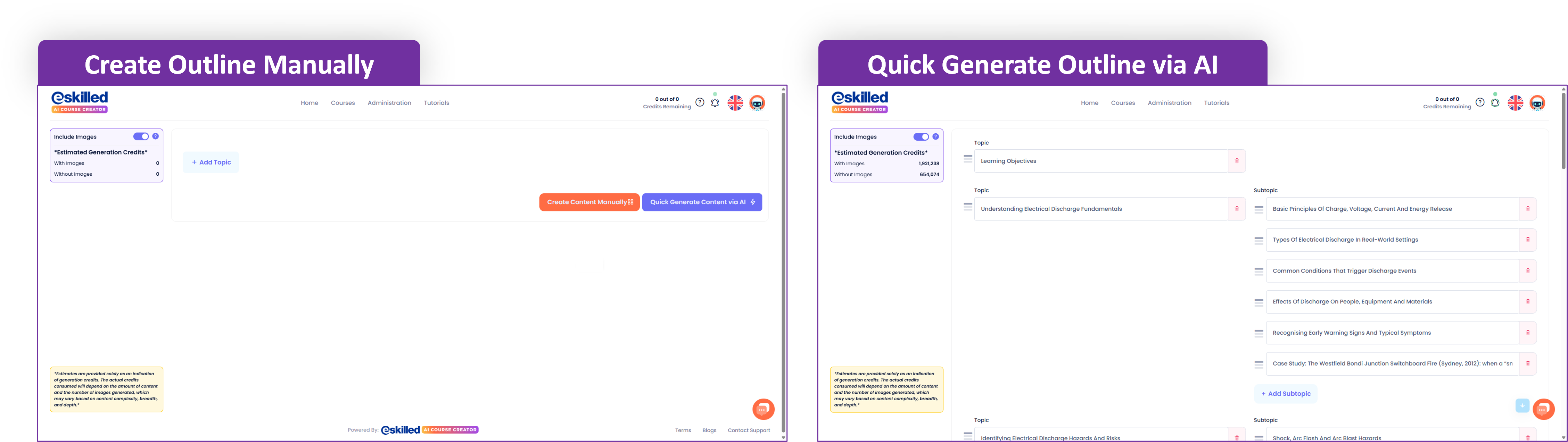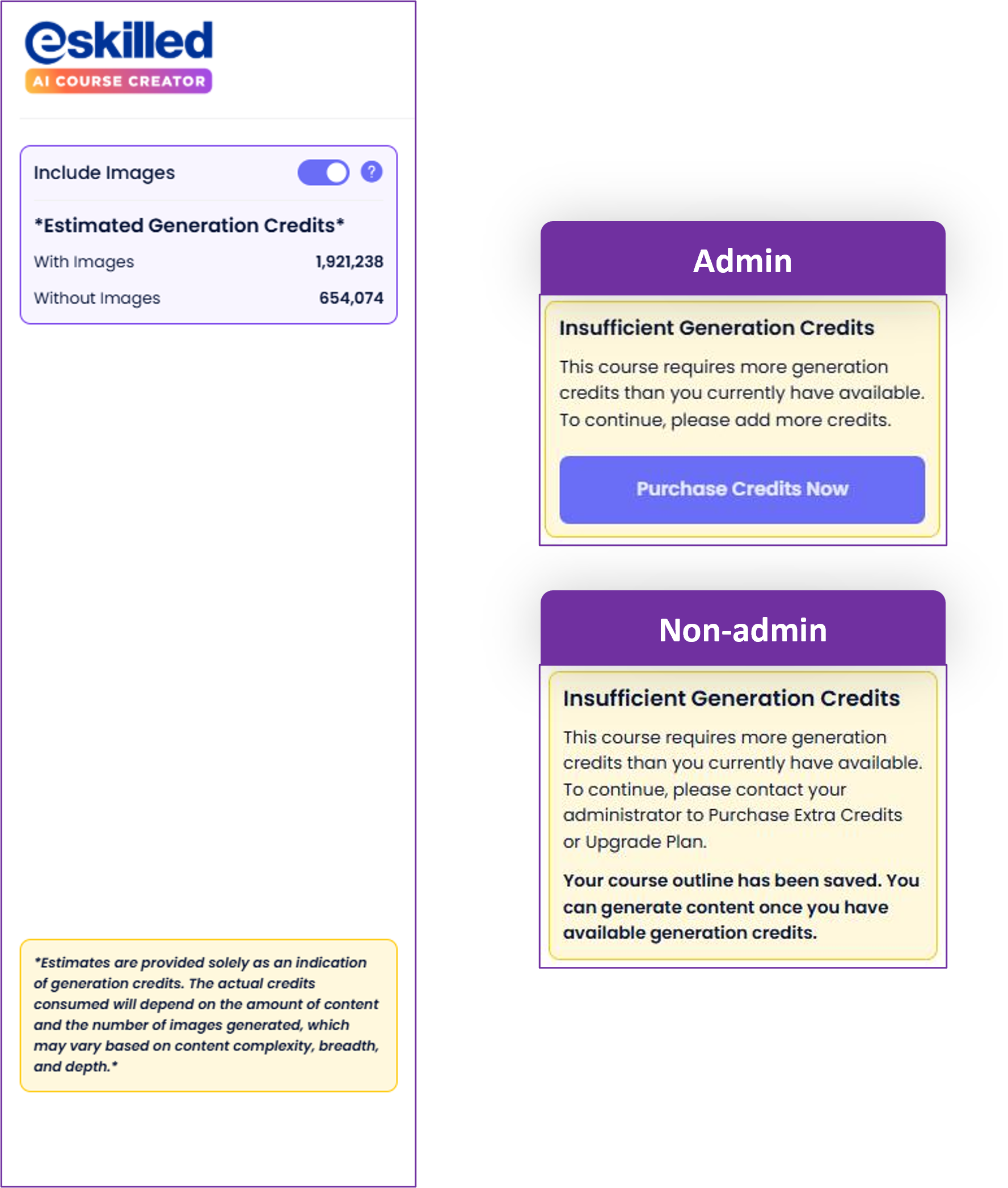 - The course creation flow for 'Creative' courses includes a real‑time estimation of generation credits on the outline page, based on whether the user chooses to generate the course with or without images. This estimated generation credit usage is compared against the user's available generation credits. If sufficient generation credits are available, the user can proceed directly with generation. If generation credits are insufficient, a note will inform the user that the course requires more credits than they currently have, including an option to purchase additional credits immediately for users with the administrator role.
