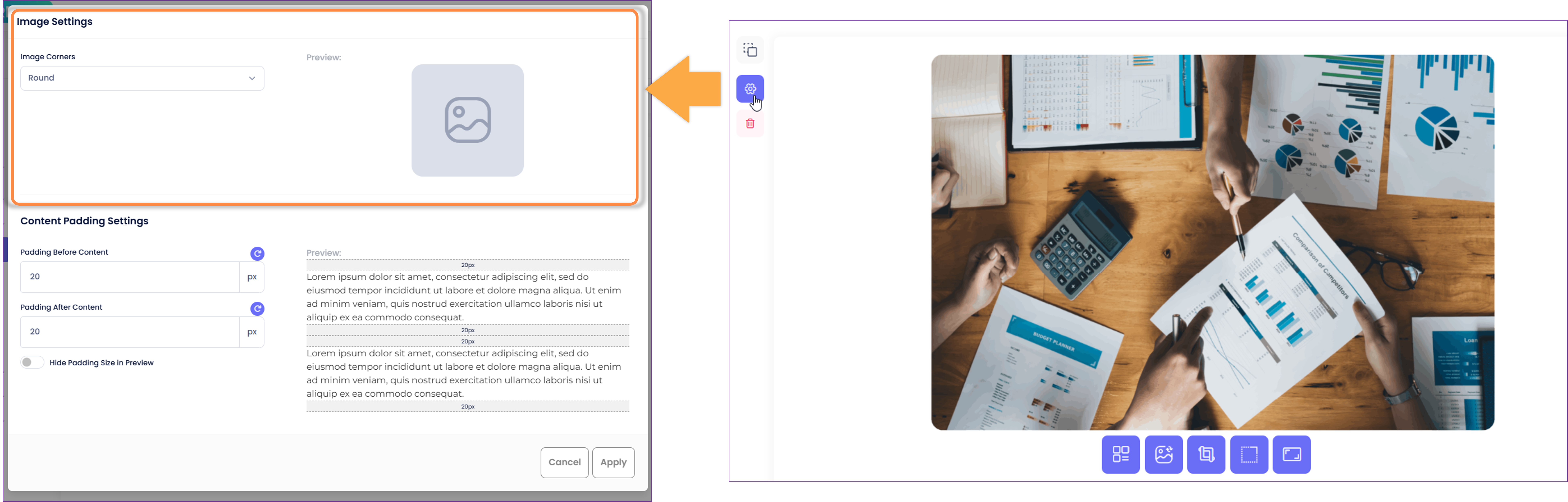 Click the 'cog' icon to display the padding settings modal. This will allow you to customise the padding settings at the course level and reset to default if needed.NOTE: When the course's theme is updated, the default padding settings of the new theme will be automatically applied to the text contents of the course.