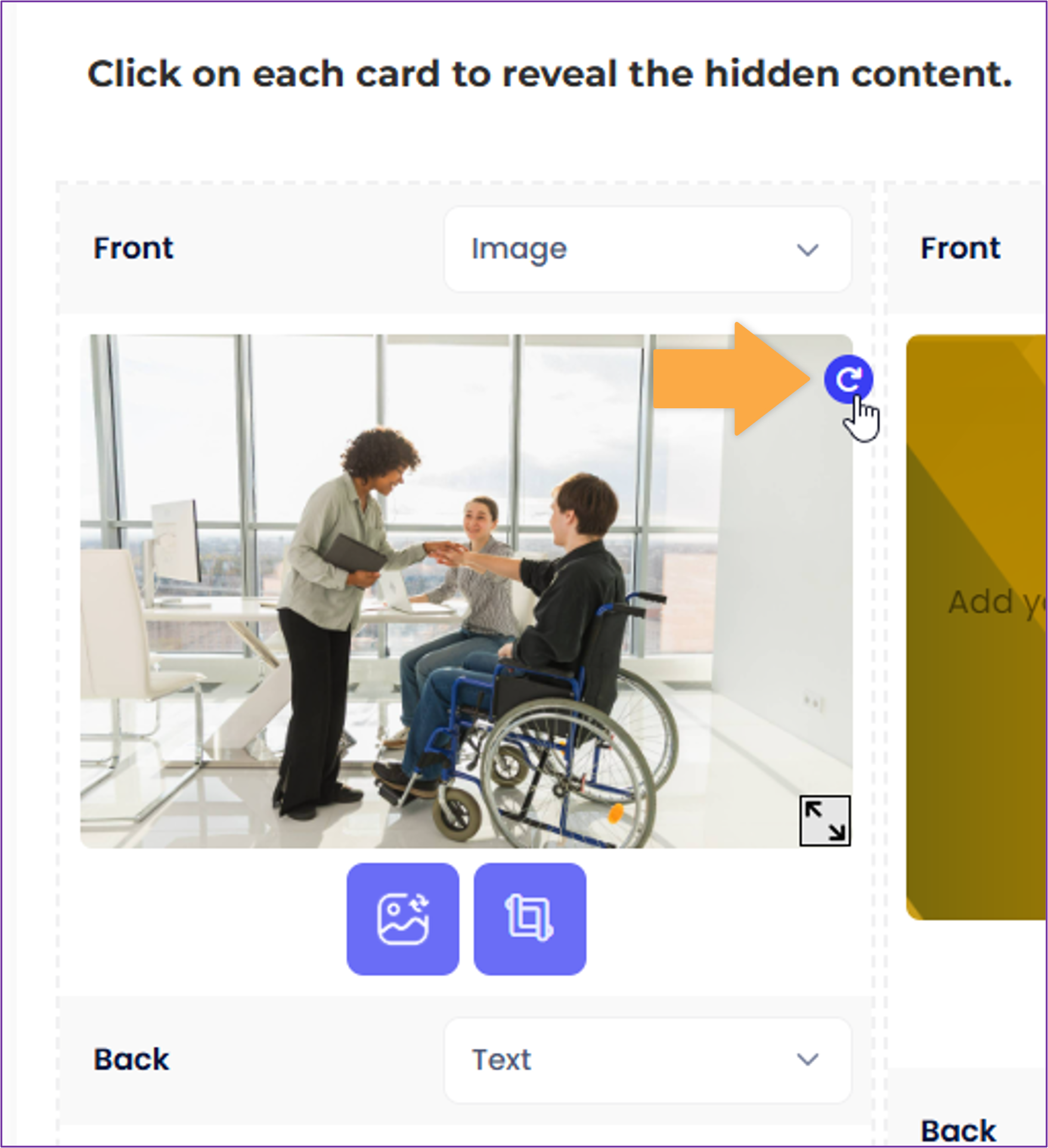 - Flip Cards will have two sections: 'Front' and 'Back' for 'Image', 'Text' or 'Text on Image' inputs. To change the content type, click the drop-down menu in the upper right corner of each section.