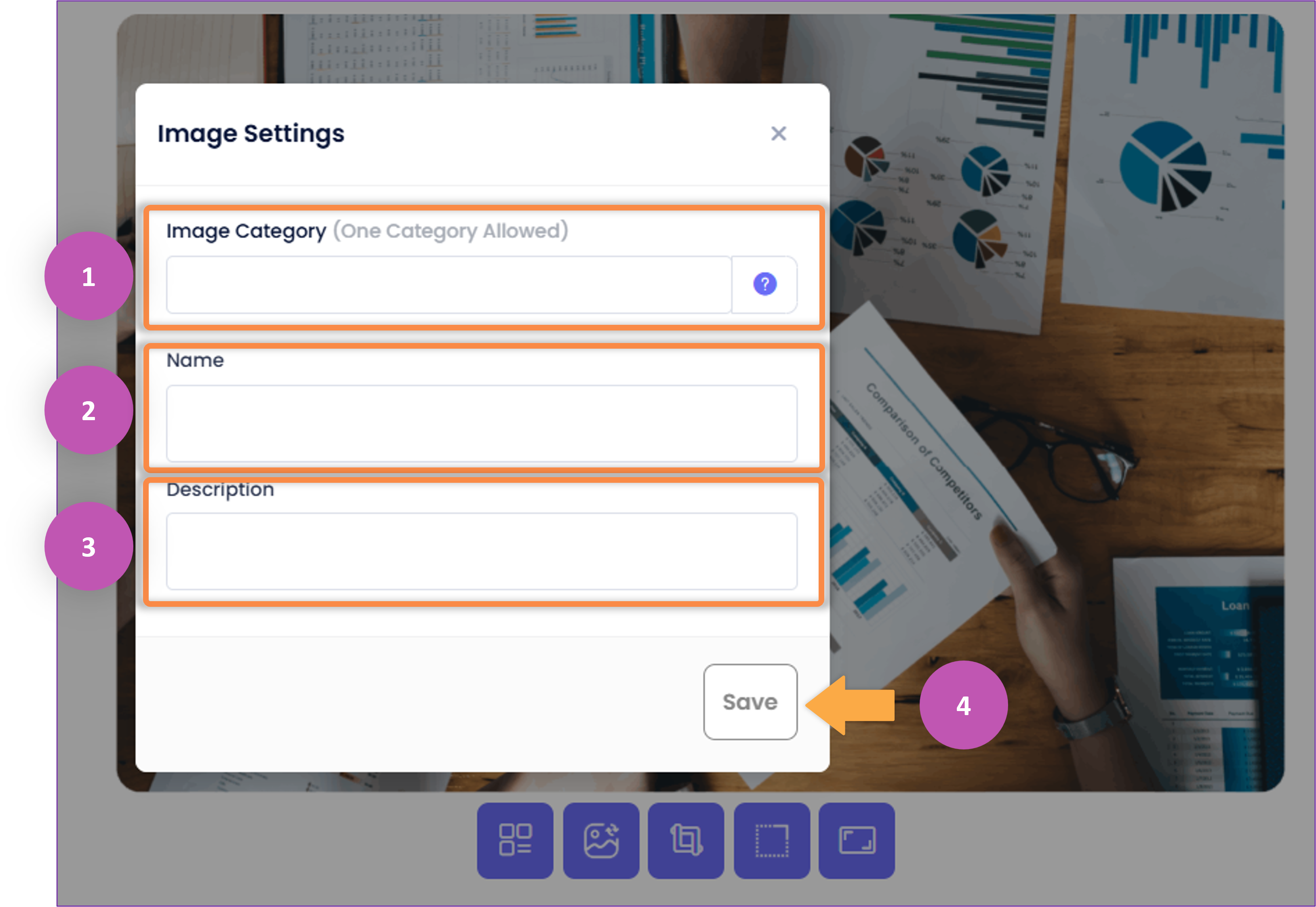 ii. When you click on the 'Image Settings' button, a new modal will appear, allowing you to set the 'Image Category', 'Name' and 'Description'.