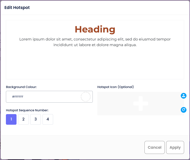 - To edit the text, simply click the 'pencil' icon and the 'Edit Hotspot' modal will open. This modal contains a colour picker for the 'Background Colour', a text input field, a 'Hotspot Icon (Optional)' settings, as well as a 'Hotspot Sequence Number'.