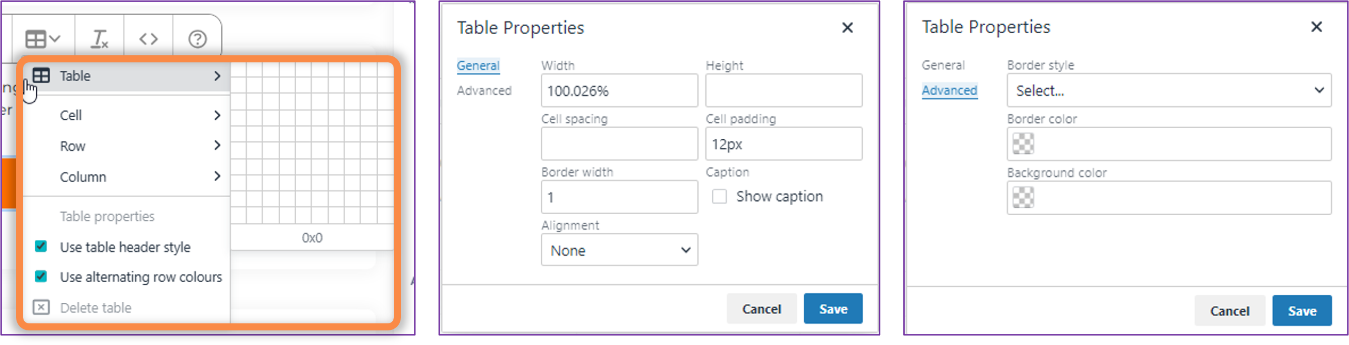 j. Text Format — Click this to alter the appearance or style of text (bold, italic, underline and strikethrough) and background colour.k. Alignment — Click this to determine the positioning of the text (left, centre, right and justified) within a text box.l. Text Case — Click this to transform the selected text into 'UPPERCASE', 'lowercase', or 'Title Case' formatting.m. Bullets — Click this to create a list of items where each item is preceded by a bullet symbol or a similar marker. Bullets help organise information into a readable and structured format.n. Table — Click this to add a table to your content. You can add an entire table with a specified number of rows and columns, or you can simply add an individual cell, row or column to your existing table. Tables are used to organise and present data, making it easier to read, compare, and analyse information.NOTE: You can freely customise the table’s appearance by using the 'Table properties' button, which provides access to both 'General' and 'Advanced' table settings, or by adjusting the properties for each cell, row or column. These options are also accessible if you right-click on an existing table.