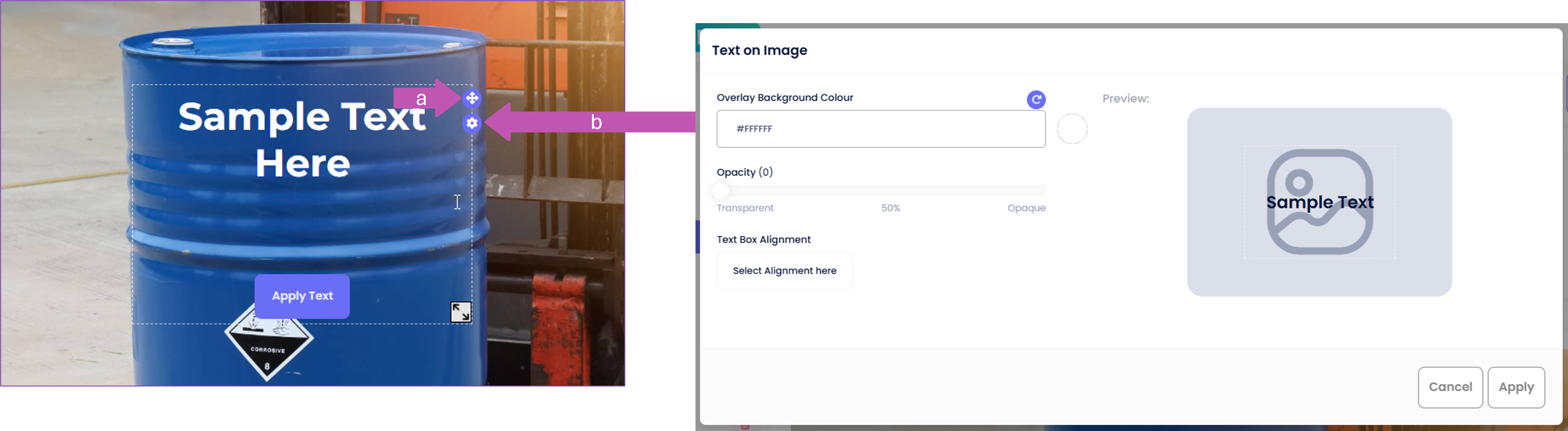 In this format, the text is overlaid directly onto the image itself. You can adjust the text font size and move it anywhere within the image.The 'Text on Image' option includes two buttons—(a) one to position the text box and (b) another to open the settings window. The settings window allows you to set the 'Overlay Background Colour', 'Opacity' level, and 'Text Box Alignment'.