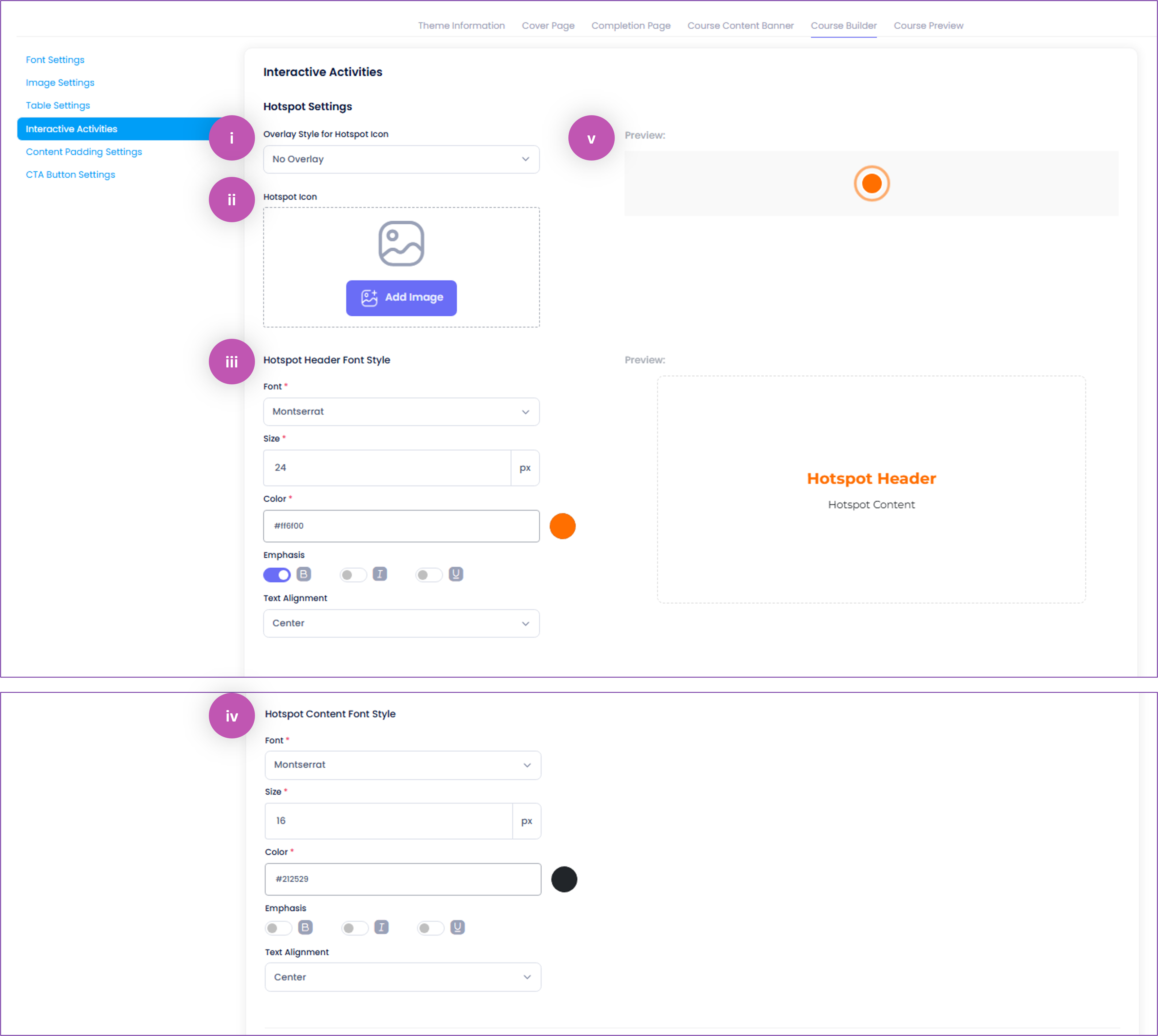 Hotspot Header Font Style — You can set a default styling of the fonts for all the hotspot headers.NOTE: The default values of these fields are matched with the theme's 'Header 6' font settings.- Hotspot Content Font Style — You can set a default styling of the fonts for all the hotspot contents.