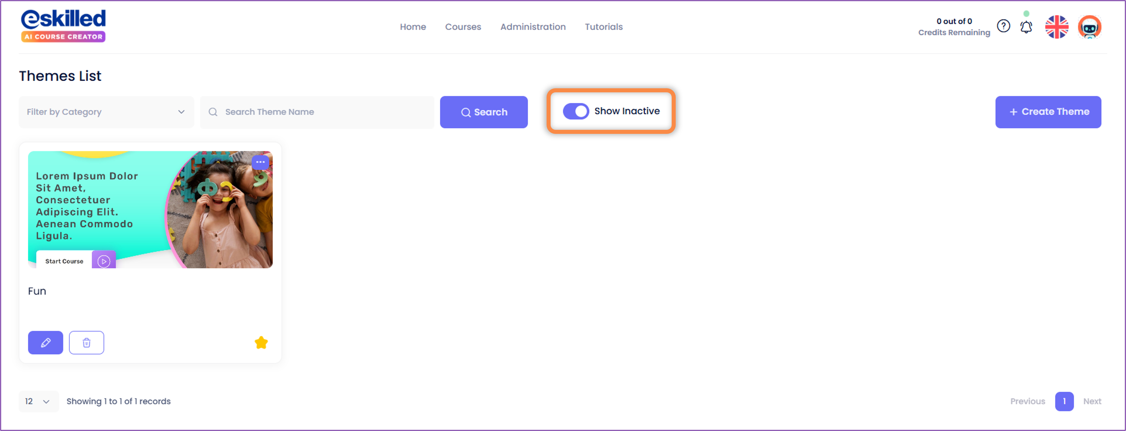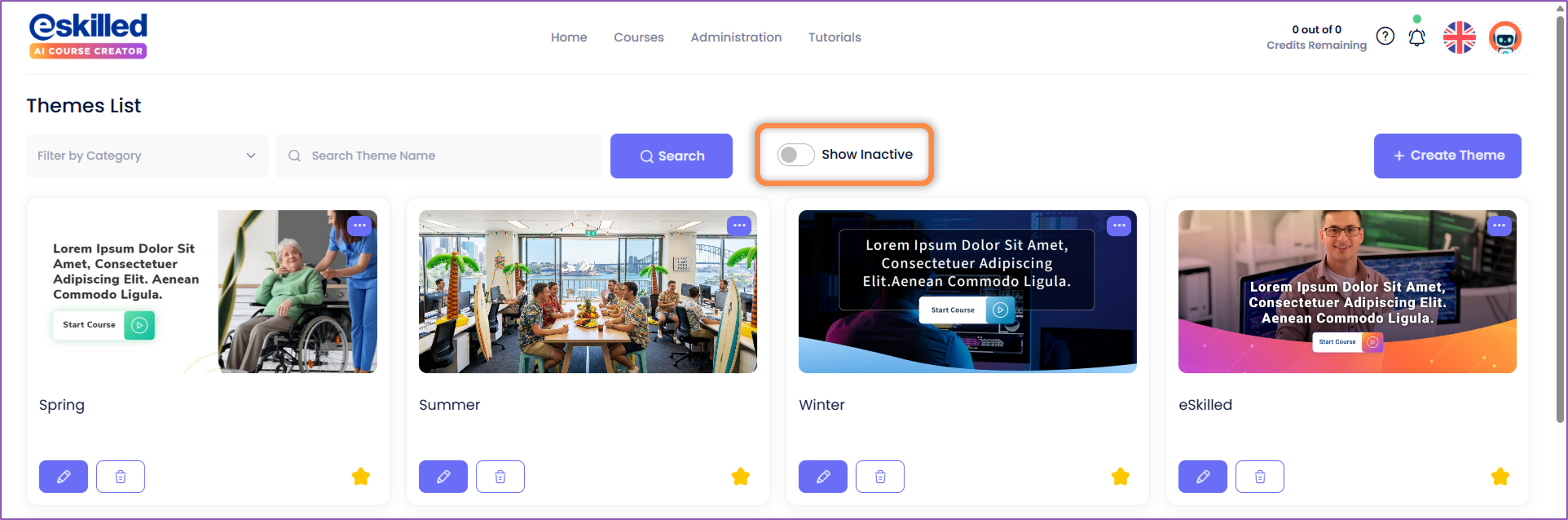 2. Active — Turn on this toggle to display the theme on the 'Themes List' page. Alternatively, disable the toggle to hide the theme.NOTE: The 'Show Inactive' toggle found on the 'Themes List' page allows you to view themes set as inactive. This is turned off by default.