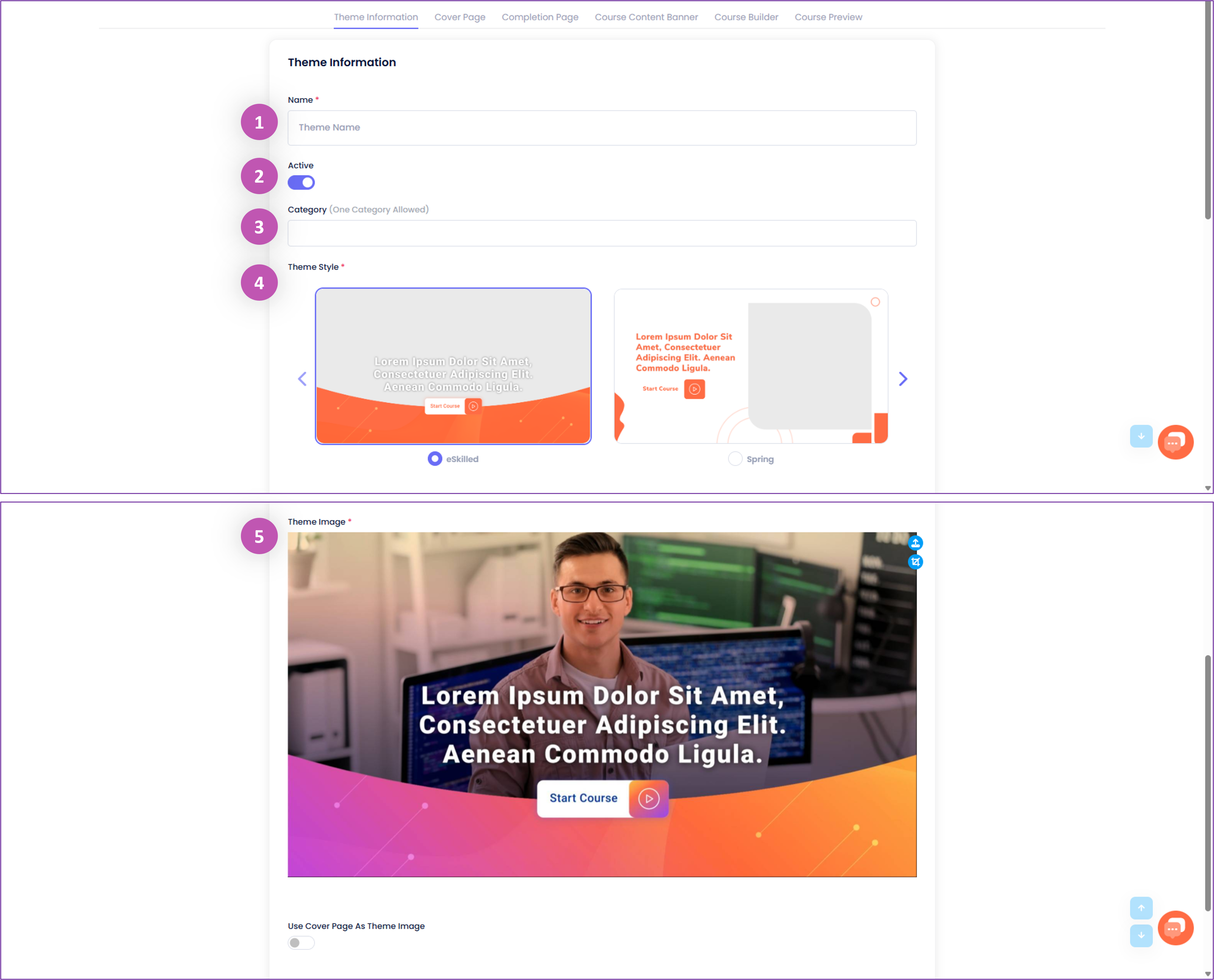 3. Category — Identify to which category this theme falls under (e.g. Finance and Hospitality).4. Theme Style — Select the style for your theme. Choose from the 6 options (eSkilled, Spring, Summer, Autumn, Winter, and Playful).5. Theme Image — Update the theme's image by clicking the 'Add Image' button.NOTE:
