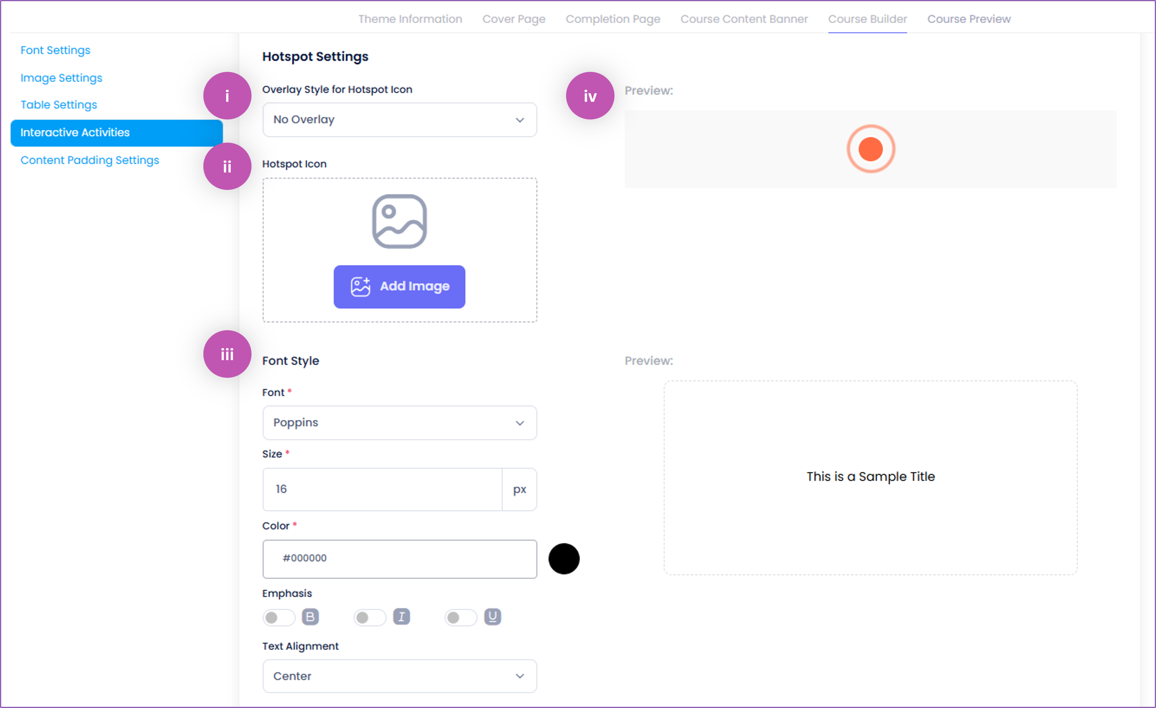 This is the background image and font colour for the course title. Replace the background by clicking the (i) 'Replace Image' button, then add the (ii) 'Course Title Font Colour'.NOTE: You may refer to the tutorial on How to Use the Tool Blocks > B. Image > Image Addition to learn more about uploading an image.