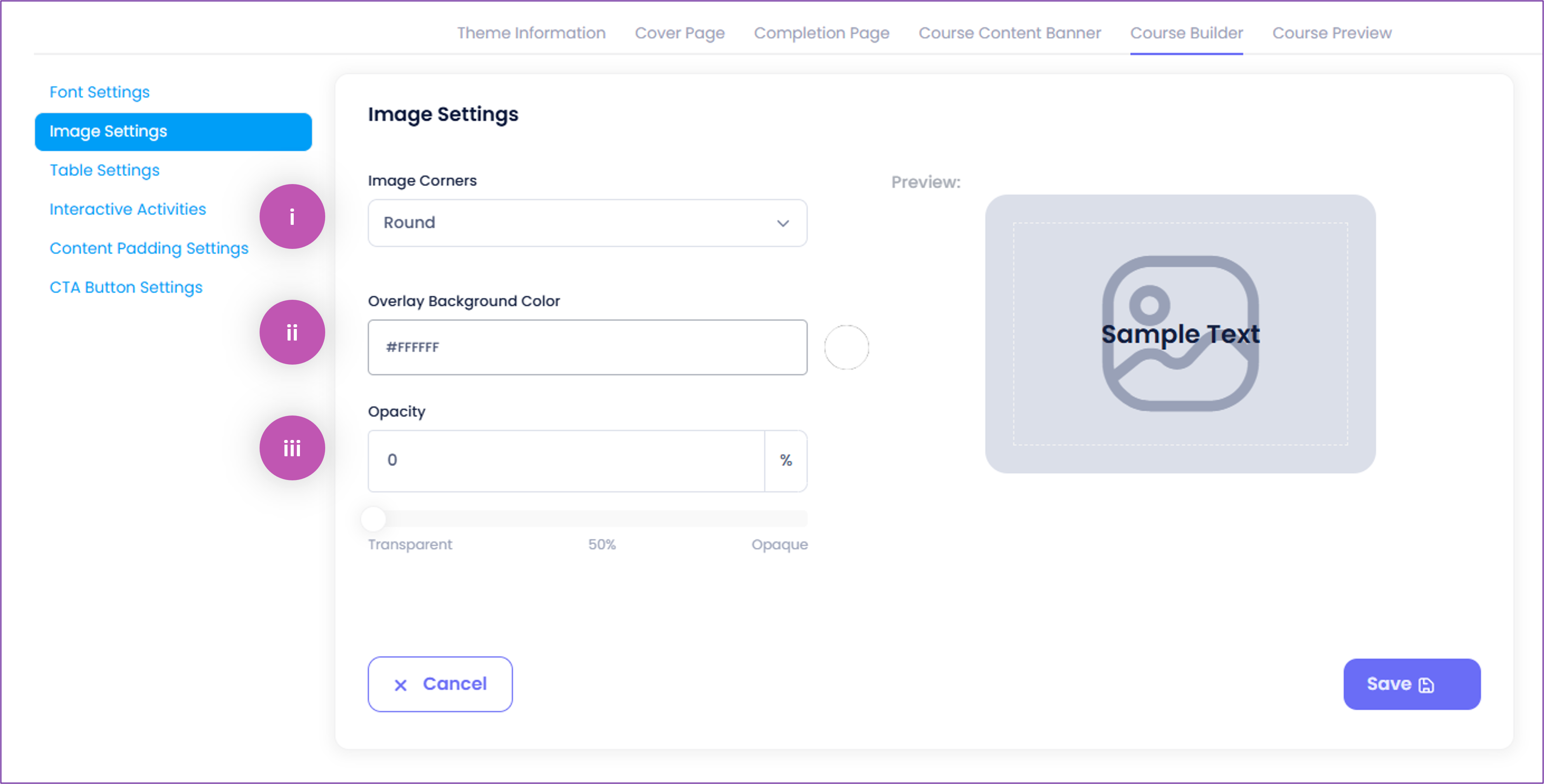 iii. Opacity (0) — Allows you to set the 'Opacity' level of 'Overlay Background Colour' for all 'Text on Image' content in your course, including the 'Text on Image' option used in Flip CardsNOTE: The default selection is 'Transparent' (0).