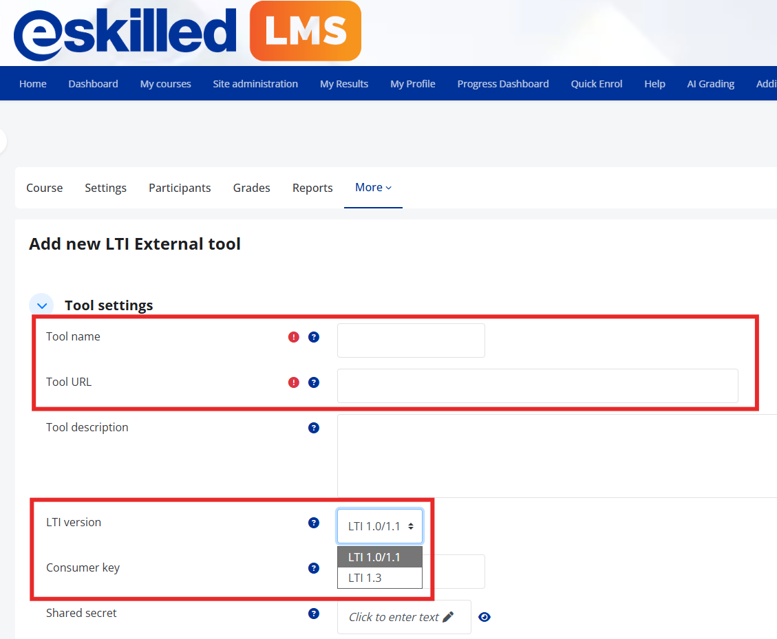 The example below illustrates how to set up LTI 1.3 using eSkilled's LMS.